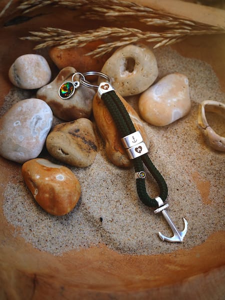 Der Ankerglücksherz-Anhänger Dünengrün vereint sanfte Naturtöne mit maritimer Eleganz. Er besteht aus dunkelgrünem Segelseil, einem versilberten Anker, einem funkelnden dunkelgrünen Kristall und zwei maritimen Zwischenstücken – ein stilvolles Accessoire für jeden Tag.