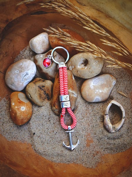 Jeder Anhänger wird mit größter Sorgfalt von Hand gefertigt. Das Segelseil wird präzise verarbeitet, der rote Kristall sicher in der Endkappe gefasst. Die versilberten Details verleihen dem Schmuckstück Robustheit und gleichzeitig Eleganz. Kleinserien-Produktion garantiert, dass jedes Stück ein Unikat bleibt.