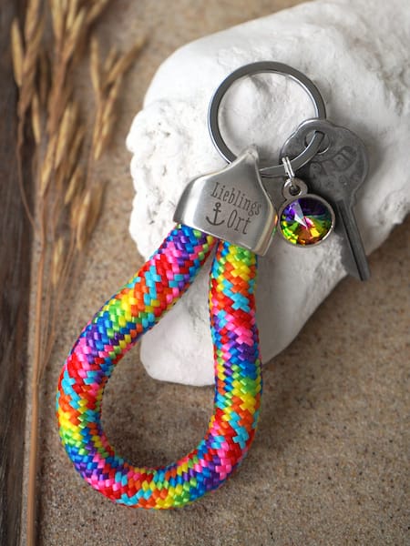 Der Ankerglücksherz-Anhänger Regenbogen „Lieblingsort“ ist ein Schmuckstück voller Symbolik und Emotionen. Das bunte Segelseil leuchtet in kräftigen Farben und erinnert an Freiheit, Lebensfreude und die Leichtigkeit des Sommers. Der funkelnde Regenbogen-Kristall bricht das Licht in allen Facetten und sorgt für spektakuläre Glanzmomente. Auf der Endkappe strahlt die Gravur deines Lieblingsortes – ein persönliches Detail, das den Anhänger einzigartig macht und mit Erinnerungen füllt.