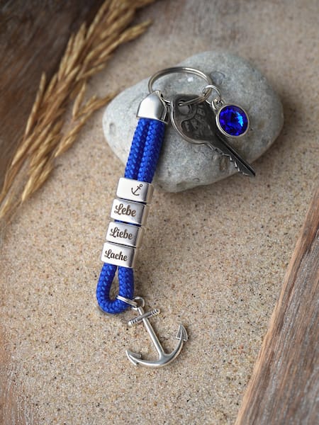 Der Ankerglücksherz-Anhänger „Lebe, Liebe und Lache“ in Silber ist ein fröhlicher Glücksbringer in royalblauem Segelseil. Die silbernen Zwischenstücke tragen die Botschaft „Lebe, Liebe und Lache“ und machen den Anhänger zu einem persönlichen Schmuckstück voller Lebensfreude, Positivität und Stil.