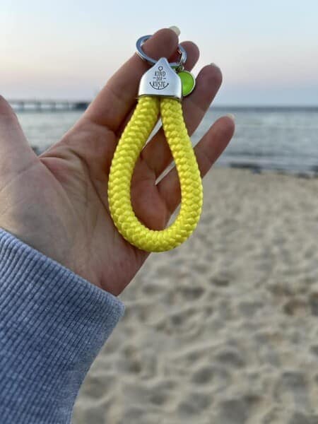 Der handgefertigte Ankerglücksherz-Anhänger Neon Gelb besticht durch ein leuchtendes Segelseil, einen funkelnden gelben Kristall und die Endkappe mit Gravur „KIND DER KÜSTE“. Ein maritimes Schmuckstück voller Farbe, Emotion und Symbolik, ideal für besondere Erinnerungen.