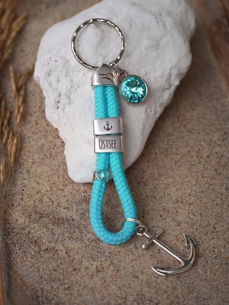 Der Ankerglücksherz-Schlüsselanhänger „Ostsee“ in Türkisblau vereint türkisfarbene Kristalle, silbernen Anker und Gravur „Ostsee“. Ein maritimes Accessoire voller Eleganz und Urlaubsflair.