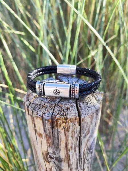 Das handgefertigte Ankerglücksherz-Armband „Sturm“ besteht aus schwarzem Leder und einem gravierten Zwischenstück mit Kompassrose. Dieses Armband verbindet maritimes Design mit symbolischer Bedeutung und ist ein stilvolles Accessoire für alle, die Abenteuer und Orientierung lieben.