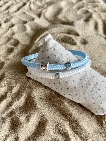 Das handgefertigte Ankerglücksherz-Armband „Käpt’n“ vereint maritimes Segelseil in Blau-Weiß mit zwei funkelnden Kristallen und einer Herzperle. Ein eleganter Begleiter mit Magnetverschluss für jeden Tag.