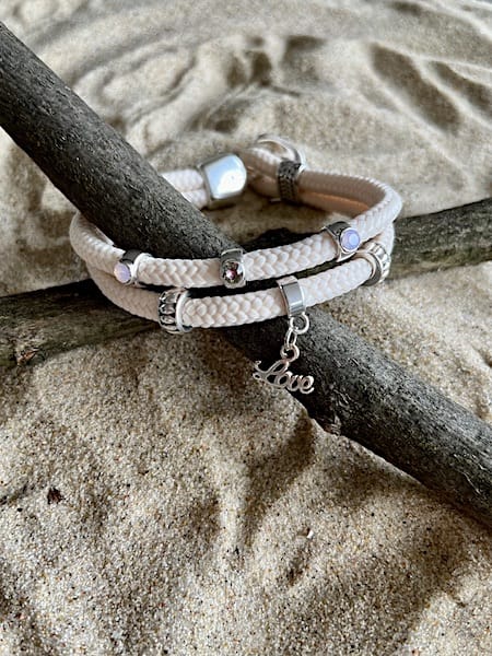 Der Love-Anhänger vereint samtfarbenes Segelseil mit drei funkelnden Kristallen und einem Ankerhakenverschluss. Elegant, maritim und voller Symbolik – ein Schmuckstück, das Liebe spürbar macht.